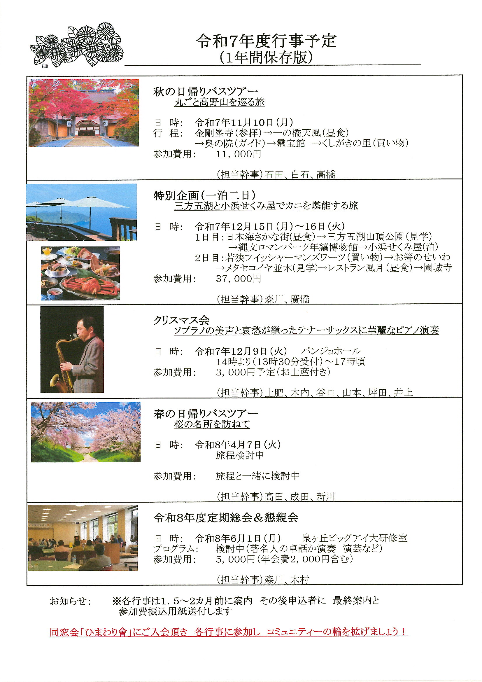 いづみ健老大学同窓会「ひまわり会」は、本年度創立41周年を迎えました。現在会員は150名です。まだ未加入の皆さま、是非とも同窓会「ひまわり会」へのご入会をお待ちしています。バスツアー、クリスマスコンサートや懇親会など盛りだくさんの行事に、沢山の会員の方々が参加し、楽しんでいます。紅葉の比叡山を堪能し、雄山荘では全国旅行支援を受け、豪華な「近江牛せいろ蒸し会席」を頂き、水庭にたたずむ佐川美術館では、常設の平山郁夫、佐藤忠良(彫刻)、吉左衛門・樂直入(陶芸)い加え、特別展の水木しげる妖怪展を楽しんできました。12月5日には関西や泉北で活躍中のアーチストによる、クリスマスコンサートをパンジョホールで行いました。出演者はソプラノ歌手・ピアノ演奏・ジャズ・男声カルテットと多彩なプログラムでした。来年は桜満開シーズンにはバスツアーを予定しています。