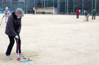 グランドゴルフは、専用のクラブとボールを使用して、ゴルフのようにボールをクラブで打ち、ホールポストにホールインするまでの打数を競うスポーツです。ボールが空中を飛ぶことはないので安全に、そしてルールも簡単な為、どなたでも手軽に楽しむことができます。